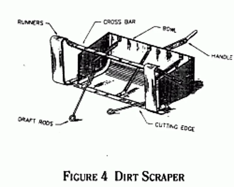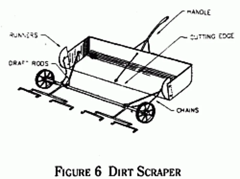 In the middle of the 1800's the Buckboard was developed in the Western United States. It was a board which was drawn in an upright position to scrape and push the soil from a high spot into the low spots, smoothing and leveling the ground. The Buckboard had a tailboard upon which the driver stood until ready to dump the soil. Slip/Scoops and Buckboards were often used in combination. The Buckboard would smooth and level piles of earth dumped by the Slip/Scoops.